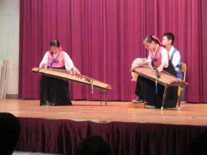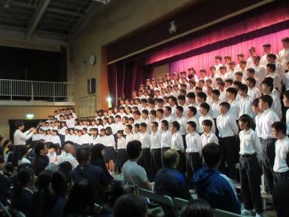 午前の舞台発表が終わりました。生徒会、2年生のビデオ発表の後、北大阪初中級朝鮮学校の皆さんに楽器演奏と踊りを披露していただきました。3年生は全員合唱です。全員が一つになって素晴らしい歌声をしっかりと歌い切りました。最後は吹奏楽部の演奏で舞台発表は終わりです。午後からは展示見学と関学大グリークラブの鑑賞になります。