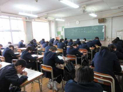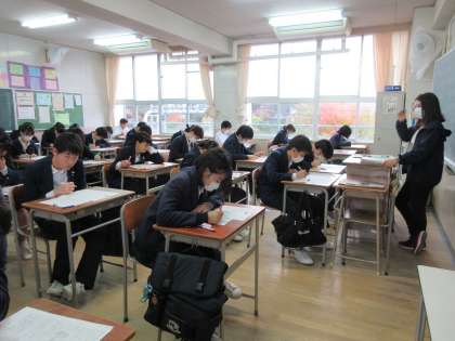 2学期末テストが始まりました。写真は、1年、2年、3年の理科テスト受験の様子です。