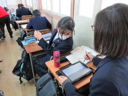 大阪市教育センターから和田指導員先生に来ていただき、2時間目に1年生理科、3年生国語の研究授業を行いました。グループ学習、タブレットを使った授業について若手を中心に研修を深めていきました。