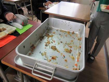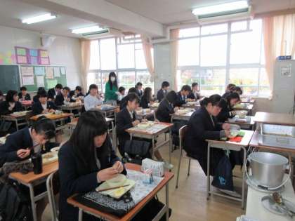 今日の献立は、オイスターソース焼きそば、キュウリの中華和え、黒糖パン、リンゴ、牛乳です。写真は3年生の給食風景、完食です。