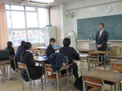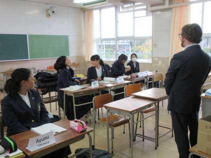 イーオンの外国人講師の方と英会話に夢中です。笑顔一杯の教室風景です。