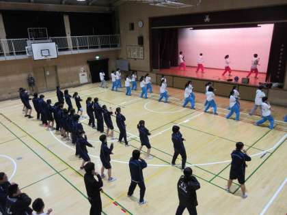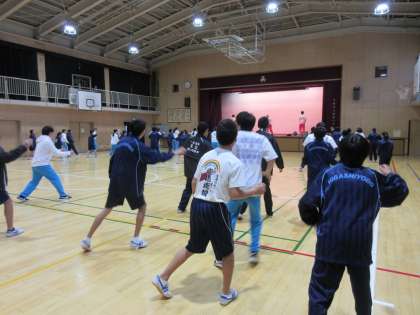 放課後に本校体育館にて大阪高校のダンス部の皆さんにダンスを教えていただきました。本校からは有志のメンバーと女子バレーボール部、陸上部の50名ほどが参加し、高校のみなさんにいろいろな動きをおしえてもらい練習していきます。1時間ほどでしたが、覚えが早く、最後には全員で揃えて踊ることができました。初めはぎこちなく遠慮した動きでしたが、最後には大きな声でリズムに乗って踊ることができ、笑顔あふれる交流会となりました。