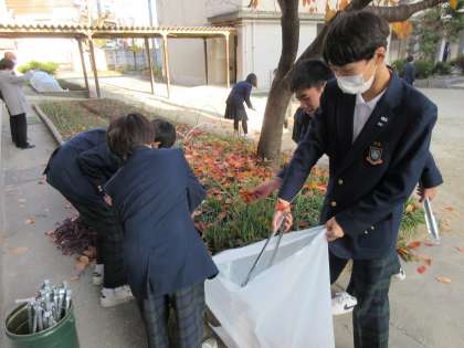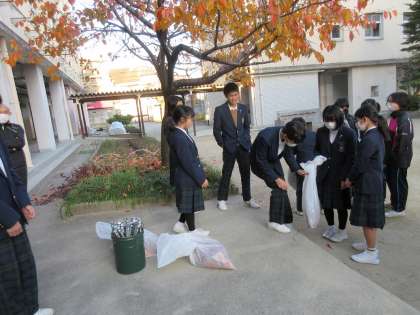 延期となっていた生徒会主催のクリーングランプリが放課後行われました。チームで校内のごみを拾い集め、一番たくさん集めたチームが優勝です。この時期、各チームのごみ袋の中は、落ち葉で一杯になっていました。
