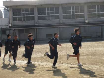 1時間目の1年1組、2組男子体育授業の様子です。2グループに分けてグランドを1周ずつタイムを測りながら、何度も走り続けています。