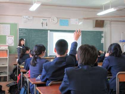 2年生各クラス1時間ずつ、栄養教諭の岡谷先生が食育の授業を行っています。1日に必要なカロリー量やバランスの取れた食事内容などを勉強しました。写真は2年4組の食育授業の様子です。