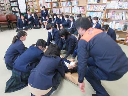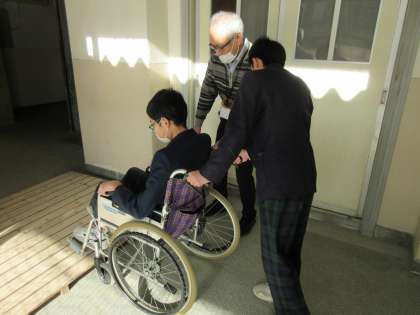 3年生は避難訓練の後、5つのグループに分かれて防災に関する様々な体験をしました。写真は車いす介助、アイマスク、救急搬送の様子です。