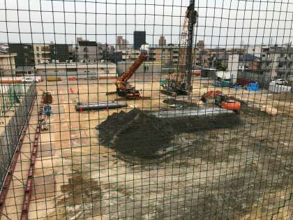 防球ネットがあって少し見えにくくなっていますが、北館校舎3階から見た、校舎増築工事の様子です。大型重機が入って、工事が進んでいる様子がわかると思います。このような状況なので、時には大きな音や振動が出たりすることもあると思います。近隣の皆様には多大なご迷惑をおかけして申し訳ありませんが、子どもたちの学習環境改善のため、ご容赦いただけますよう、お願い申し上げます。