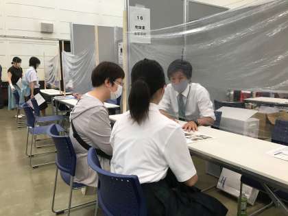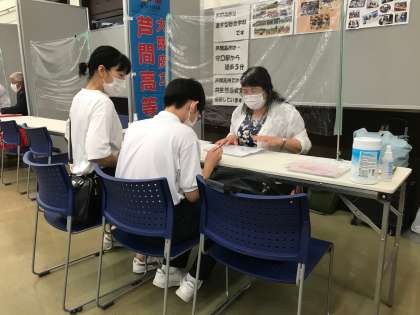 高校ごとのブースで、熱心に話を聞く姿が見られます。