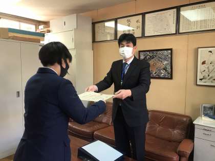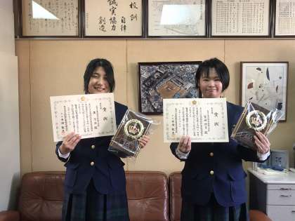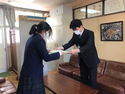 本来ならば、区役所で表彰されるのですが、コロナ禍ということで、校長室での表彰式です。会長賞に1組の廣さんと宮崎さんが選ばれました。おめでとう!