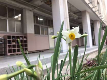 本校は大阪市の中でも比較的大きな敷地を持つ学校なので、広い中庭があります。季節ごとにいろいろな花が咲いていますが、今は水仙が良い香りを放っています。
