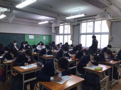 写真下は2年3組。小テストに真剣に取り組んでいます。テストが終わったら勉強は終わり、ではありませんね。何のために学ぶのか、しっかり自分なりに考えながら授業に取り組んでほしいと思います。