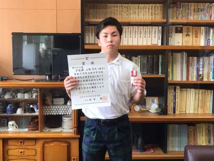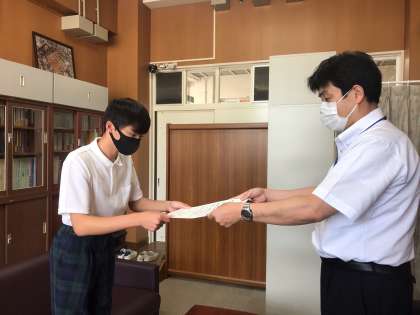 6月5日・6日に行われた春季総体。各部門で本校の生徒が活躍しましたが、陸上と柔道で優秀な成績を残しましたので、校長室で表彰式が行われました。それぞれ、校長先生から優勝と準優勝の賞状とメダルを授与していただきました。