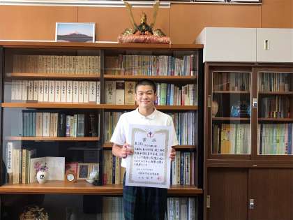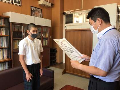 7月18日(日)に行われた大阪中学校夏季柔道大会(兼近畿大会・全国大会予選)で、個人戦第3位の優秀な成績を残しましたので、校長室で表彰式を行いました。