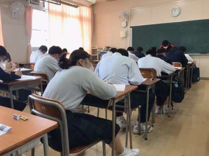 今日、3年生は3時間を使って英語力調査のテストを受けています。
