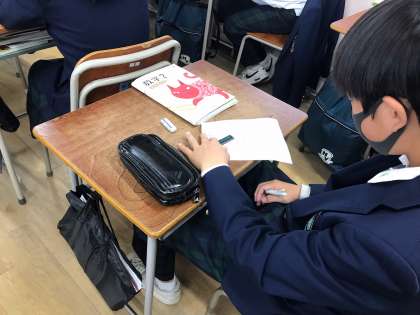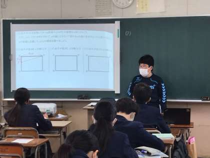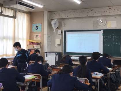 4時間目、2年3組は数学の研究授業でした。一次関数を利用して、三角形の面積が変化することを学びます。点が動く様子を映像で可視化することによって、理解を助けます。生徒たちも熱心に課題に取り組んでいました。