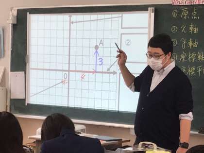 2限1年6組。座標平面上の点を、座標を使って表す学習です。座標の表し方を確認するために、プロジェクターを使ってわかりやすく説明します。実際に座標平面上をどのように動くのかが可視化されるので、理解しやすくなっています。