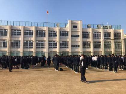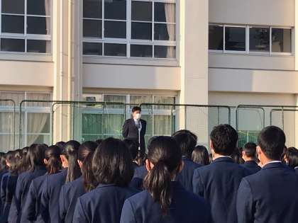 朝方は冷え込みましたが、風もなくいいお天気の中、全校集会が行われました。