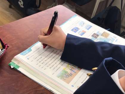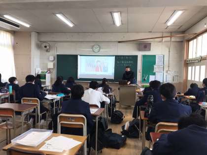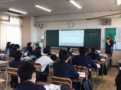 1年3組、2限の授業。教員がデジタル教科書を使って授業を進めていきます。「今,どの単語を発音しているか」が色分けされていることによって可視化されます。目と耳、両方で理解することができるので、わかりやすくなっていますね。