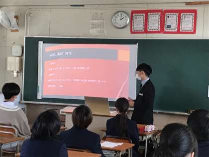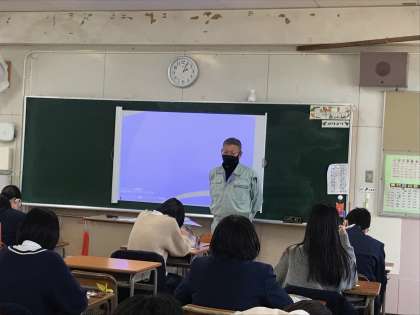 例年なら「職場体験」に出かける2年生。けれど、今年度はコロナ禍でなかなか体験学習が難しい。と、いうことで事業所の方に来ていただき、仕事についてのいろいろをお話いただきました。