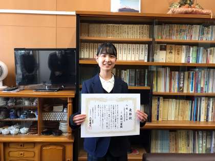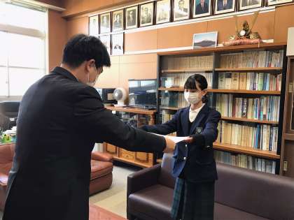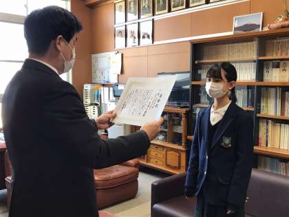 その中で、1年生の久保さんの作品が入選したので全校(放送)集会で伝達、校長室で表彰状の授与が行われました。