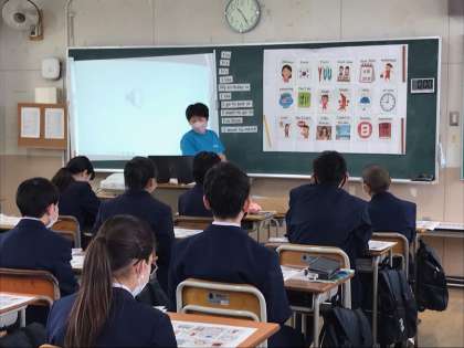 1年生では、週1回、C-NETの先生と昨年度小学校専科で教えてもらった先生の授業があります。中学校に入って教科ごとに担当の先生が変わる中、顔見知りの先生がいるということでずいぶん心強いようです。活発な意見のやり取りが見られます。