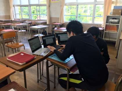 今日の1限は、各家庭で1人1台端末を使ってのオンライン授業です。各学年とも、泊行事や校外学習を控えているので、その説明がされています。