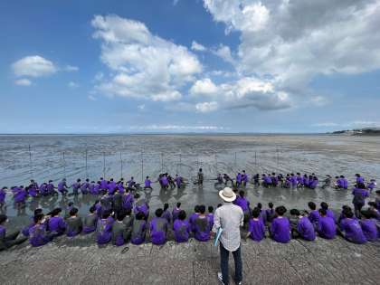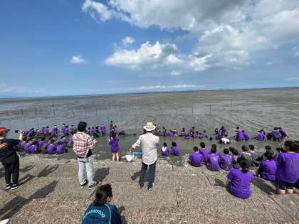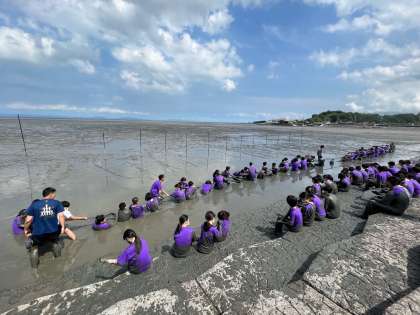 ★第一試合[5位・6位決定戦]は1組vs5組、★第二試合[3位・4位決定戦]は3組vs4組、★第三試合[決勝戦]は2組vs6組です。緊張感のただよう有明海の干潟会場です。ただいま、会場は最高に盛り上がっています。どのクラスも、力を合わせて頑張って!!