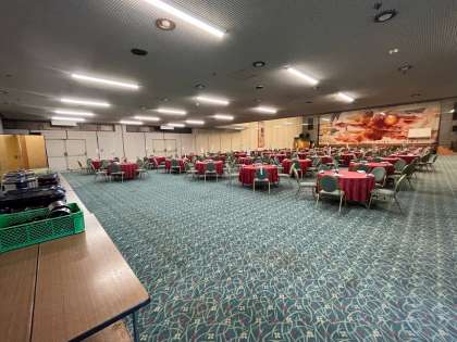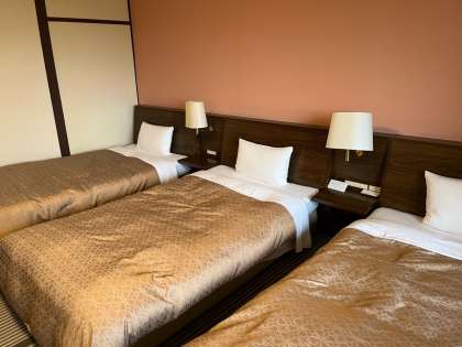 19時40分からの入館式・夕食までの時間に、クラスごとで入浴を済ませます。入浴後は、自由時間を過ごすことになります。のんびりした時間で、心も体も休まります。自由時間は限られていますが、各自がそれぞれの過ごし方をしながらリラックスしているみたいです。(写真は、ホテルの男子3人部屋のある一室/男子浴場の窓から見える外の風景/夕食会場のダイヤモンドホールです。