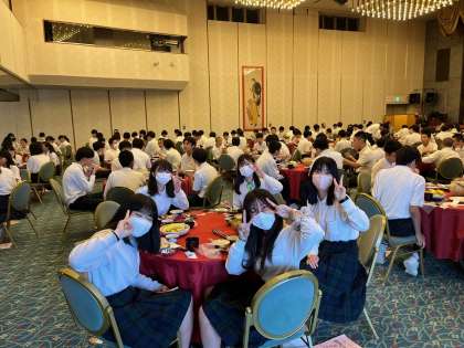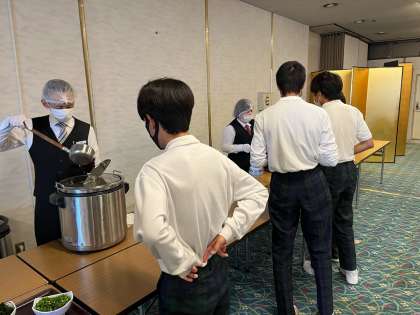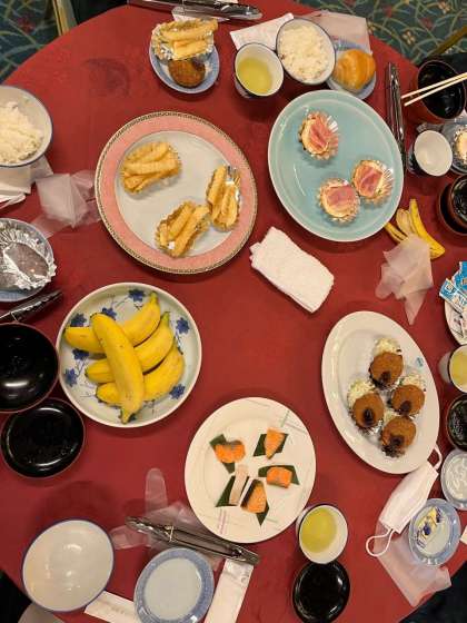 退館式を終えて、朝食の「いただきます!」をしました。美味しそうな朝ごはんです。別コーナーで、パンなども用意されています。(食卓の写真ですが、食べ始めてすぐの配膳の様子を写真に撮れていません。)