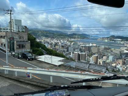 予定通り、9時00分に、ホテル「にっしょうかん」を出ました。ホテルの方々にお見送りいただき、バスは平和公園に向けて進みます。ホテルの目の前に見えるのは、長崎港です。そして、長崎港にかかっている橋が、女神大橋(めがみおおはし)です。[写真は、バス車内から撮影したものです。]