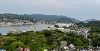 ? 2日目の夕食が終わり、食事の最後には、食事係の「ごちそうさまでした!」の言葉で、夕食タイムは終了となります。ここで、毎回(?)のことですが、お楽しみ(?)のインタビュー(?)があって、子どもたちがワクワクしている時間帯があります。それは、「ごちそうさま」を言う前に、食事係から、料理のことでいつもインタビューされる先生がいて、その先生の「こたえ」がおもしろいのです。(誰でしょうかね、その先生って? 1枚目の写真にその先生は写っていますよ。)2枚目の写真は、ある部屋から見える女神大橋(めがみおおはし)です。3枚目の写真は、現在地マップで、青丸印が今いる場所を示しています。