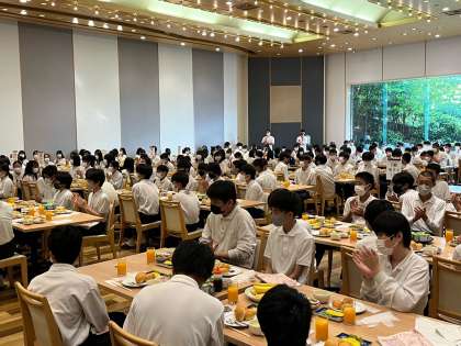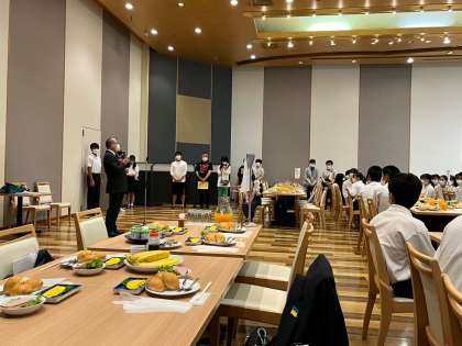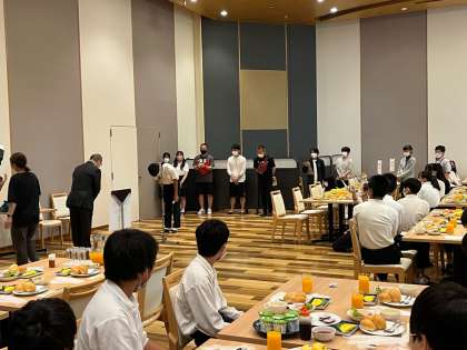 朝食前に、食事会場で「退館式」をおこないました。おいしい食事、大きな浴場、キレイな夜景、いろんなことに感謝して、代表生徒からお礼の言葉を伝えました。ホテルの方からは、「いい思い出を作って帰っていただけると嬉しいです。」というようなメッセージをいただき、今日も、いい一日のスタートが切れたような気がしました。