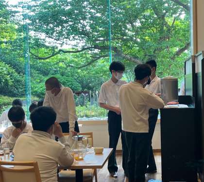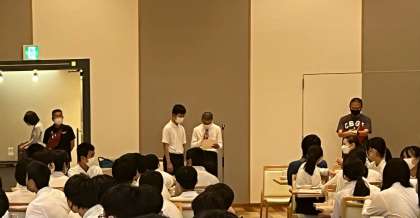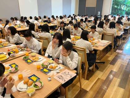 食べ終わった後は、食事係の「ごちそうさま!」になります。ところで、この時に、食事係から料理のことで質問される先生がいつも同じだったはずなのですが、今回は別の先生にインタビューの依頼がありました。食事会場がいつもと違う雰囲気に包まれる中、その先生の「こたえ」は、「オレンジジュース!」でした。にこやかな笑いに包まれる食事会場となりました。