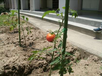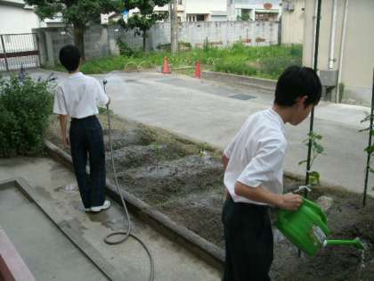 特別支援学級では5月の末に、特別支援学級の前にある畑に生徒と先生で野菜の苗を植えました。