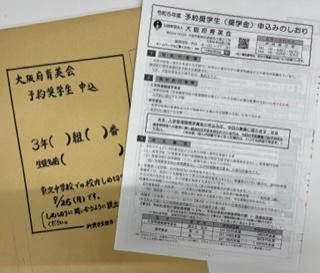 大阪府育英会の予約奨学生(奨学金)の校内での申し込み締め切り日が、9月26日(月)です。大阪府育英会の「奨学資金」[=高等学校等の在学中に貸付する学資]は、今回の申込だけではなく、中学校卒業後の進学先での申込も可能ですが、「入学時増額奨学資金」[=高等学校等の入学前に貸付する学資]については、今回の申込に限られます。なお、申込用紙(予約奨学生申込のしおり)は、すでに配付済みの別紙でお伝えしました通り、3年生全員配付ではなく、申込希望のある場合のみ、お子様を通じて配付することになっています。ご希望される場合には、提出期限(9月26日)に間に合うように、できるだけ早く学校までご連絡ください。