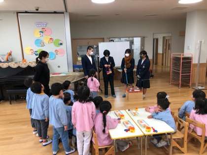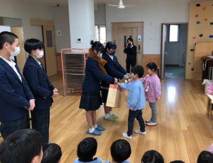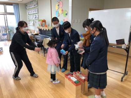 本日の放課後、1年生の代表者が地域の保育所へ学年で作成したおもちゃを届けに伺いました。