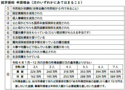 ※援助を受けるためには、ページ下部の表のいずれかの申請理由にあてはまっていることが条件です。