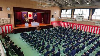 新入生が入場し、式が始まりました。 校長先生の「祝辞」を、みなさんはしっかりと聞いています。