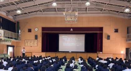 4/20(木)、1年生は6時間目に体育館で学年集会をおこない、一泊移住に関わる全体説明を聞きました。