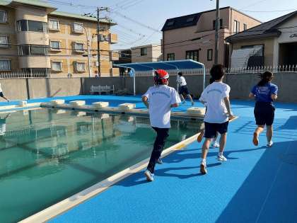 廊下などのスペースを使って、筋力トレーニングやフットワークのメニューに取り組んでいます。水泳部もプール掃除をして、水を入れるまでは、プールサイドでトレーニングです。