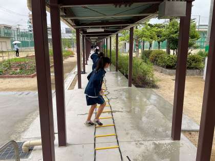 陸上部やバスケットボール部は廊下での筋力トレーニングやラダートレーニングをしていました。