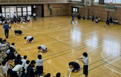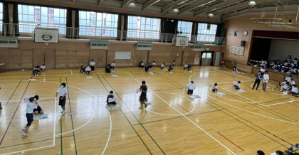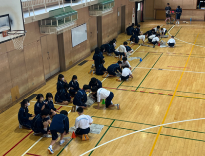 「新聞つなぎ」です。30秒ごとにメンバーが入れ替わり、新聞紙を切って、のり付け、切って、のり付けを繰り返しながら、長くつないでいく競技です。