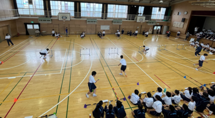 「お玉リレー」です。お玉に乗せたボールが落ちないように、ハードルをくぐって、コーンをすばやくまわり、次の走者につないでいく競技です。