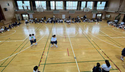 「風船運びリレー」です。2人1組で風船をはさみながら走り、スピードをきそうリレー競技です。これが最後の競技ということもあり、どのクラスも応援に力が入っています!!