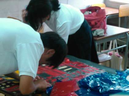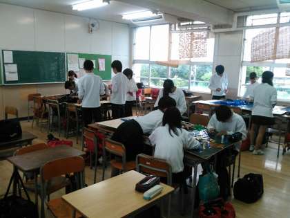 3年生の舞台発表、構成詩劇と展示発表、ステンドグラスの制作風景です。舞台は音響照明のチェック、展示はセロハンの切り貼りなどの作業も行っています。文化発表会当日が楽しみです。