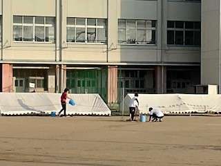 昨夜は雨が降ったので、早朝より先生方が運動場を整備してくれていますが、