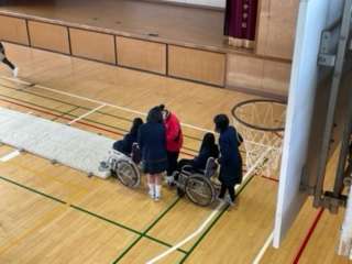 2人1組で車椅子に乗る人と介助の人に役割を分け、体験します。