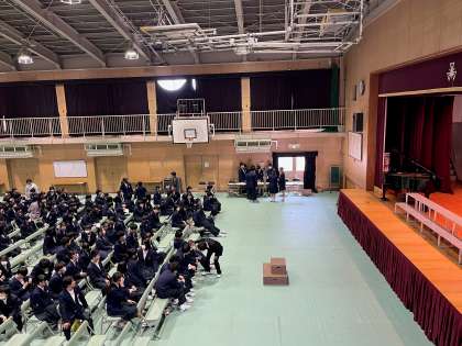 合唱コンクールでは、各クラスごとに「課題曲」と「自由曲」の2曲を歌います。「自由曲」は各クラスで選んだ曲で、「課題曲」は『My Own Road 〜僕が創る明日〜』という曲を全クラスが歌います。2組の合唱の後、3組、4組の順に歌い、前半3クラスの合唱が終わったところで、休憩に入りました。休憩後に、後半の3クラスずつ(5組、6組、1組)が歌う予定です。