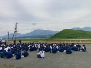 3方面に分かれて、バスで移動します。入村式をして、民泊先の方とあいさつをする予定です。遠くに阿蘇山・火口丘が見えます。
