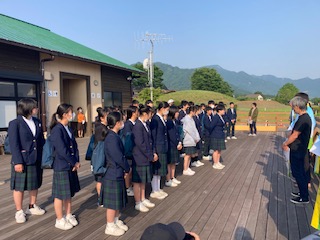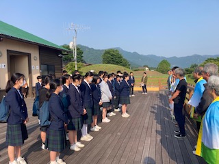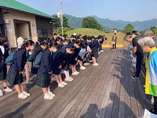 代表あいさつの様子です。いちごやトマト畑の農作業、山へ行き放牧、薪割り体験、かまどご飯など。